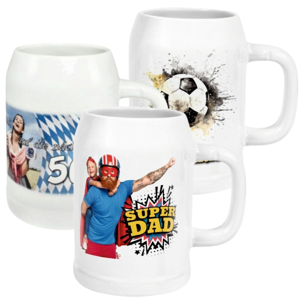 Bierkrug zum bedrucken mit deinem Lieblingsmotiv für Bier-oder Radlerfans. Echte Bierliebhaber wissen individuell bedruckte Bierkrüge zu schätzen. Dieser massive Krug ist ein besonders beliebtes Geschenk für Arbeitskollegen bei Verabschiedung in den Ruhestand oder zu vielen anderen Anlässen, wie z. B. für Stammtischfreunde, zum Geburtstag oder zu einem Jubiläum.